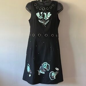 This elegant black dress features beautiful floral accents, perfect for any occasion. The intricate design adds a touch of sophistication. Has pockets, missing one button on back panel, please see photo! EUC PET FREE SMOKE FREE HOME