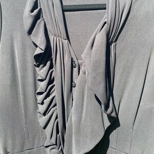 A Nanette Lepore Chic black dress with ruffle details. The neckline has an asymmetrical ruffled collar.