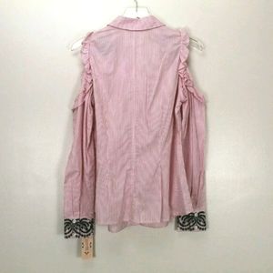 Nanette Lepore Flamingo Dreams Button Shirt Medium Pink White Stripe Embroidered