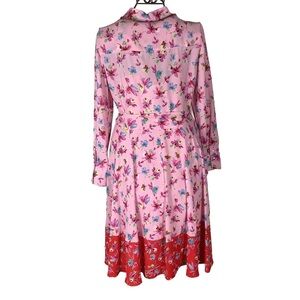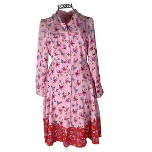 Step into bold femininity with this stunning Nanette Lepore dress. Featuring a vibrant pink floral print throughout and a striking red floral border at the hem, this dress combines elegance with playful charm. The tailored shirt-dress silhouette includes a belted waist, button front, collared neckline, and long sleeves. Comes fully lined with a pink under slip for a polished finish.