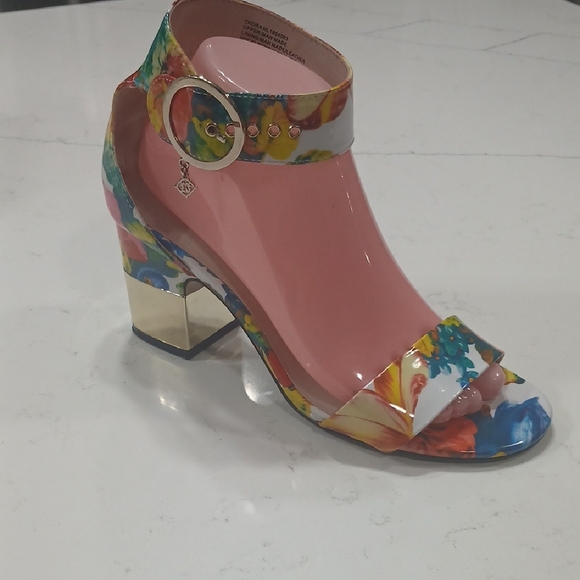 Colorful floral design with ankle strap. Features a sturdy block heel.