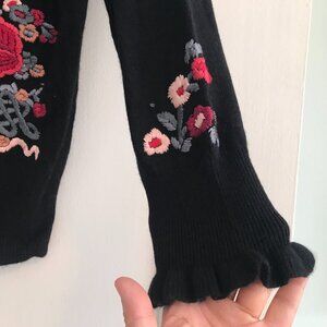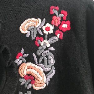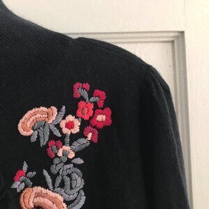 Elegant black merino wool sweater with vibrant floral embroidery. Keyhole opening at chest. Mock neck collar. Covered buttons back closure at neck. Long sleeves.