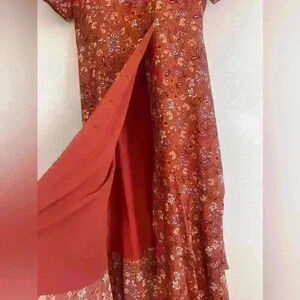 Wrap dress with cross over neck. Short Puff Sleeves. Tiered Skirt with button down front closure. Woven Construction. All-over floral pattern.
