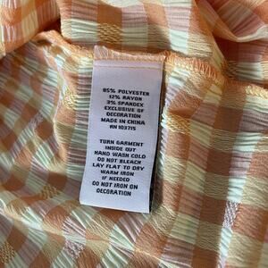 Sweet late summer transition dress in orange and yellow gingham, crinkle gauzy texture with tiered skirt and tie keyhole neck. 3/4 sleeves with stretchy ruffled hem. Cute ruffles on neckline. Spooky season layering into fall with a cardigan.