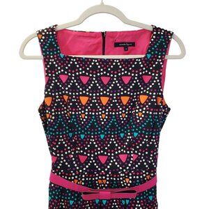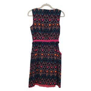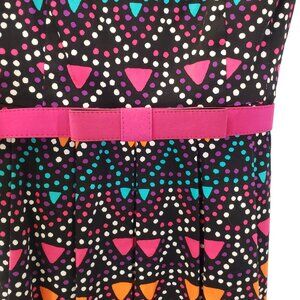 Adorable and bright graphic print fit and flare dress that has a structured bow design belt that snaps shut. Back zipper closure and side pockets. The pink and orange colors are almost a neon color so bright for sure. Great dress for work or a cocktail party.