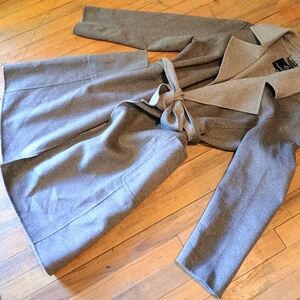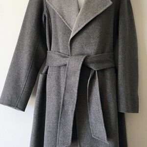 Elegant gray trench coat with a stylish belt. Perfect for any occasion.