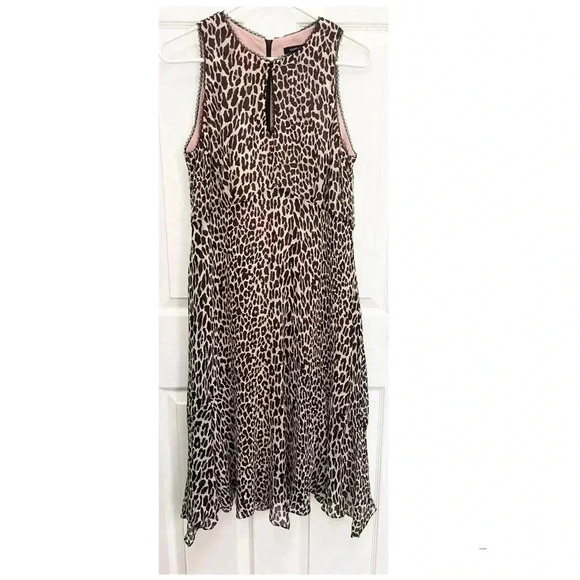 100% silk leopard midi dress. Gorgeous leopard print, sleeveless, dress with eyelet down the chest. The most delicate of lace trimming!