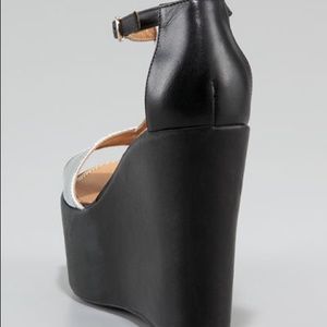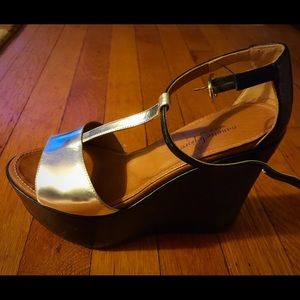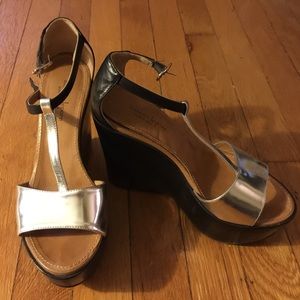 Gorgeous Nanette Lepore metallic wedges...they go with everything! 4 1/2" covered wedge heel; platform lowers the pitch. Made in Italy.