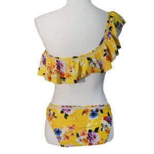 This 2-piece bikini by Nanette Lepore features a beautiful floral print against a yellow background. Both the top and bottom are lined inside with a solid yellow fabric. The top is made of 83% nylon and 17% elastane. The bottom is made of 94% nylon and 16% elastane. The ruffled top is kind of like a bandeau, except it has one strap that's wide and goes over the wearer's right shoulder. On the wearer's left side where it's strapless, there's a piece of vertical whalebone so that the top stays up and keeps its shape. The bottoms are hipster-style and have a tiny metallic "n" emblem (for "Nanette") on the back.