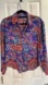 Vibrant floral blouse with a mix of purple, red, and blue. Button-up front. Long sleeves. Perfect for a bold look.