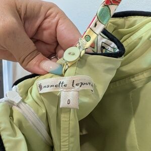 Chic structured sun dress by nanette Laporte with vibrant floral patterns and black trim. size 0. used gently. approximate measurements in photos. d3