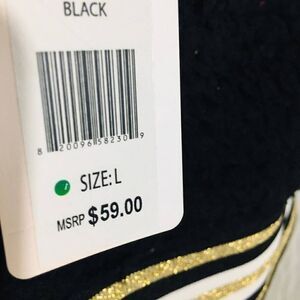 Solid Black Teddy Fawx Shearling Pullover Sweater. White, Black, and Gold stripes on the bottom and sleeves trim. It's new with tags. Please refer to pictures for best description and condition verification.