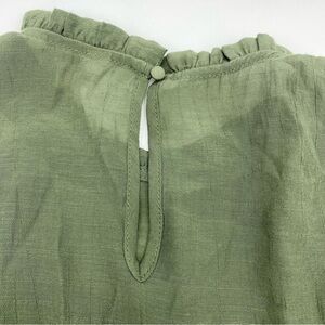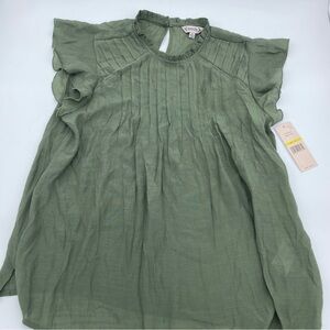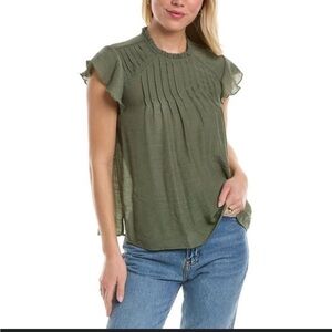 Elegant olive green blouse. Features pleated design. Short flutter sleeves. Lightweight and stylish.
