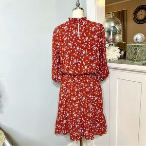 Nanette Lepore Rust Orange Floral Ruffled Hem Fit and Flare Dress. 1/2 sleeves with elastic cuffs. Smocked elastic waist and neckline. Keyhole front and back. Pull on style. Fully lined. Like new-never worn. Size 10.