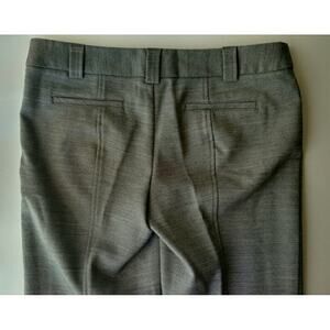 Gray slacks have a four pocket construction. Two small front pockets and two back pockets. Belt loops. Zip fly with double hook closures.
