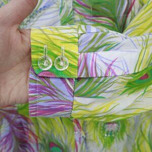beaded, button-down closure, long sleeves with buttoned cuffs, collared neckline, peacock feather print, lightweight fabric, boho, vibrant, colorful, artsy, playful, tropical, summery, eclectic, nature-inspired, whimsical, vacation, creative, artistic, brunch, garden party, unique, statement piece