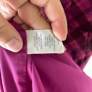 Previously loved, no holes or stains. 100% wool, polyester lining.