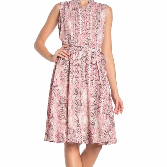 This Nanette Lepore dress features a striking pink snakeskin print and a flattering pintuck design. With a tie belt for a customized fit, it's perfect for any occasion. The sleeveless, midi length adds elegance and comfort to your wardrobe.