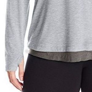 NANETTE LEPORE soft jersey stretch knit casual active pullover hoodie with lazer cut detailing, raglan long sleeve with thumb holes, mesh trim hem. Soft hand feel hooded fitness work out top.