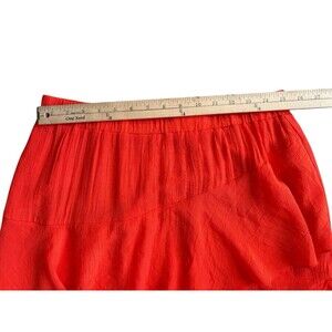 This Nanette Lepore skirt is a flowy, romantic piece in size Large, featuring layered ruffle tiers in a vibrant red color. It has a pull-on closure for easy wear and is made of a blend of rayon and polyester. The A-line silhouette falls to knee length and is perfect for occasions like travel, weddings, parties, or casual outings. Ideal for a bohemian-themed look, this skirt is machine washable and suitable for summer, fall, and spring wear.