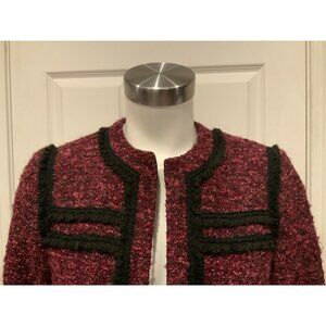 This Nanette Lepore jacket is a must-have for any stylish woman! The purple & pink tweed material is complemented by black fringe trim, adding a touch of playfulness. 3/4 sleeves and a hook & eye closure make it easy to wear, while the jacket is lined and has pockets for added practicality.