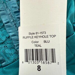 Elegant teal silk blouse featuring a keyhole front. Round neckline secured with crystal button. Ruffle trim at neck. front placket, and cap sleeves. Side-zip closure.