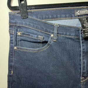Nanette Lepore Belle High Rise Bootcut Jeans Dark Wash Denim Button Zip Closure 5 Pockets Stretch Bow Logo on Back Pocket