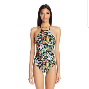 Gorgeous and fun one piece by swimwear goddess Nanette Lepore. The design is super cute with fun colored fruits on a black background. The front is sexy with the lattice cutout and while I was terrified that it would not hold me in, the boob pads helped to keep everything in place! The strappy back is amazing and it is not hard to get in/out of at all. The ties also have cute tassels on the end. I bought this suit and only wore it once so it is in excellent condition! It just didn't suit me ☹