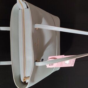 Amazing deal on this bag-in-a-bag set of two purses by Nanette Lepore. The larger bag is a shoulder tote. The color is a lighter dusty blue with gold hardware and tan interior. The smaller crossbody bag has a white background with lemons and strawberries. It has a white strap with a gold chain and gold hardware.