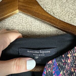 Nanette Lepore Sheath Dress Size 0P Blue/Black Printed Short Sleeve Notch V Neck