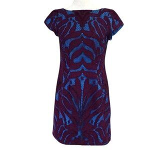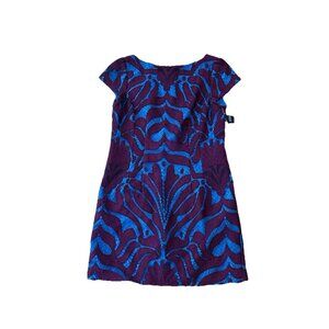 The Nanette Lepore Sheath Dress in Blue/Burgundy Silk, size 12, is a stylish and sophisticated choice for various occasions. This dress features a geometric pattern, a boat neck, and short cap sleeves for a feminine look. The dress is made of a luxurious blend of polyester, silk, rayon, and acetate, with a lace fabric type for added texture. With a zip closure and a layered accent, this short dress is perfect for travel, parties, or casual wear, and is sure to make a statement with its sexy and elegant design.