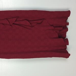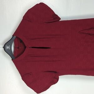 Red. Embossed pattern on the entire dress. High, split neckline with button closure. Flutter sleeves. Faux wrap skirt with ruffle hem. Banded waistline. Back zip with button closure. Fully lined. Excellent condition -- no stains, rips, or fraying. Laid flat pit-to-pit: 17in. Laid flat waist: 15.5in. Shoulder to hem: 41in.