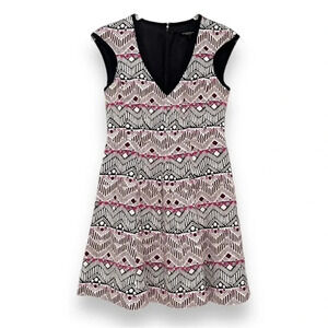 Nanette Lepore Abstract Print Silk & Linen Dress. Deep V-neck, fit and flair silhouette, sleeveless, back zipper closure, fully lined. Colors: Navy Blue, White, Purple, Pink. Size 0. Approximate chest measurements: from armpit to armpit 16.25”, waist circumference at waist seam 28.5”, dress length 31.75”. In excellent condition!