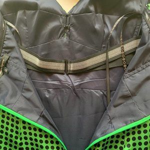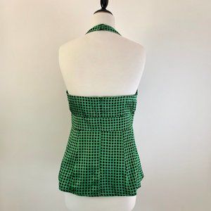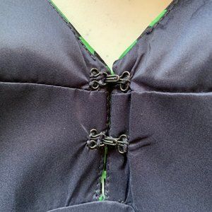 Never worn - like new condition. Green with navy polka dots - 100% silk with navy acetate lining. Pleated bust with hook and eye closure in center. Buttons at back neck and a back zipper. Inside elastic band that fastens in the back for more support. Pleated detail in front. Size 10 is approx. 16 1/2" across bust, 15 1/2" across the band below the bust and is 24" long.