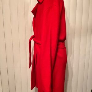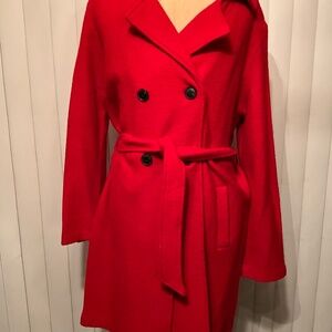 This lovely Nanette Lepore has a wool feel. The label doesn't show the fabric type so we can't verify it's wool. This coat comes with a belt, all buttons and two pockets. This coat is elegant, light weight and ready for winter and fall. This coat even looks better than the pictures. Take a look at our other coat listings.