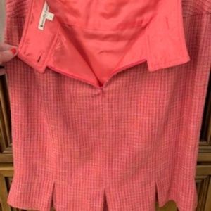 Pink tweed with ruffle bottom and pink lining. Zipper closure with two buttons in the back.
