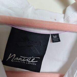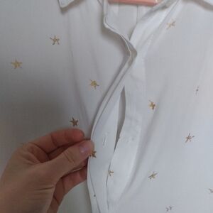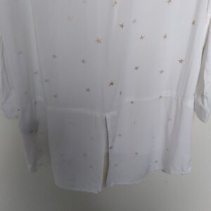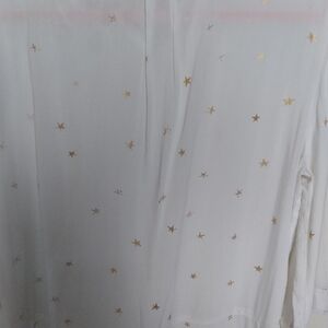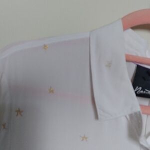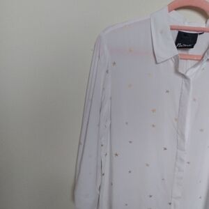 Nanette Lepore classic white button front shirt with shimmery glittery metallic gold star print throughout