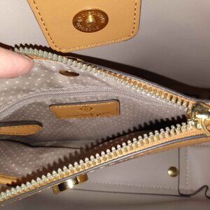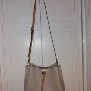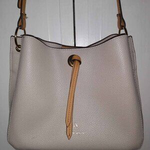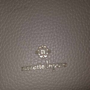 Nanette Lepore leather bag with adjustable shoulder strap and 5 compartments. Stone with brown trim. 10"X8"