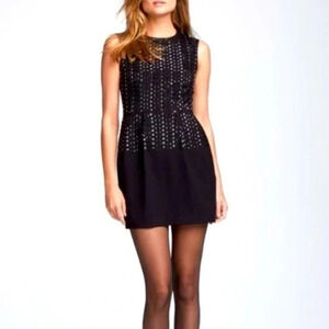 Nenette Lepore black sleeveless scoop neck stretch knit dress embellished with metal studs, side pockets, back zipper closure, fully lined. Approximate measurements: length 35”, chest from armpit to armpit 16”, waist circumference 30”. In very good condition!