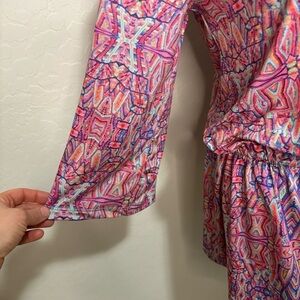 This adorable coverup is in good condition! Split v-neckline, roll tab sleeves, elastic drawstring waist. Perfect for looking stylish by the pool!