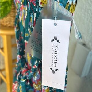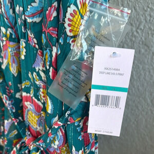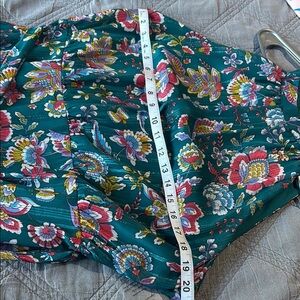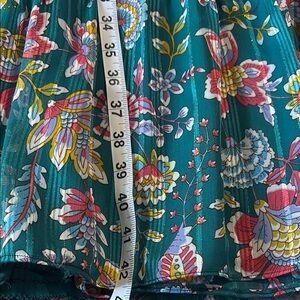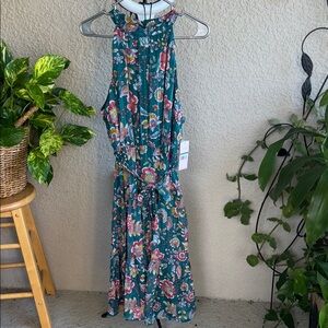 Elegant teal midi dress with colorful floral design. Sleeveless with a flattering fit.
