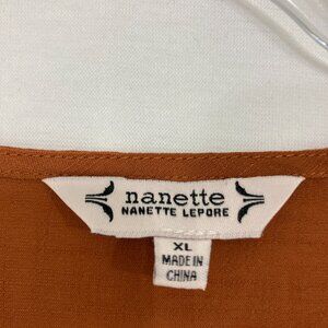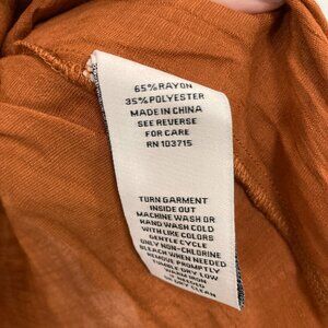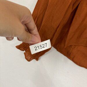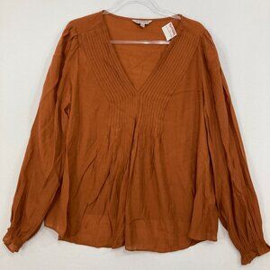 Chic terracotta blouse with pleated V-neck. Long sleeves with gathered cuffs. Lightweight fabric. It’s perfect, my arms are just too fat /strong😢
