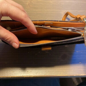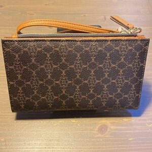 Nanette Lepore vegan leather wristlet wallet. One large zipper pocket. A snap pocket with place for cards. A front large snap pocket.