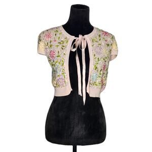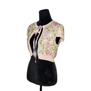 Nanette Lepore Vtg Beaded Embellished Baby Pink Cardigan Shrug With Ribbon Tie S