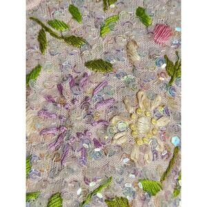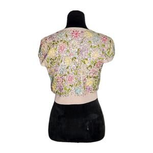 This Nanette Lepore vintage beaded embellished baby pink cardigan shrug is a charming and feminine piece perfect for a party or cocktail occasion. The tight-knit floral pattern, accented with beads, embroidery, and sequins, adds a touch of elegance to the short cap sleeve shrug. Made from a blend of rayon and cotton, this lightweight sweater is designed to fit a size small with a classic fit. The cropped style and delicate details make it a versatile piece suitable for all seasons, showcasing a blend of coquettish, 90s, and fairy themes in its design. Crafted in Hong Kong, this cardigan is a beautiful addition to any woman's wardrobe.