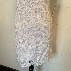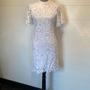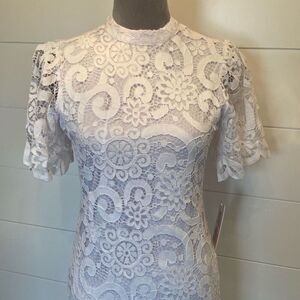 This white Nanette Lepore mini dress features a chic sheath silhouette with lace short sleeves and a mock neck, perfect for a bridal or wedding guest occasion. The Mandarin collar adds a touch of elegance, while the short sleeves and intricate lace detailing offer a feminine flair.