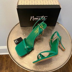 BRAND NEW! Nanette Lepore is an American fashion designer based in New York City and her gypsy-influenced designs are feminine and youthful. These colorful heeled sandals are accented with a beautiful gold chain. The shoes can be worn in casual or formal affairs.