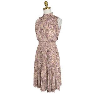 This elegant pink midi dress by Nanette Lepore features a sleeveless design with a sophisticated mock neck and a flattering A-line silhouette. The fitted bodice transitions into a pleated skirt, offering graceful movement, making it perfect for wedding guest or cocktail occasions. The delicate pink hue adds a touch of femininity to this stylish piece.