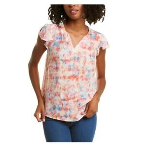 Nanette Lepore Women's Flutter Cap Sleeve V-Neck Ruffle Top Orange Watercolor