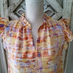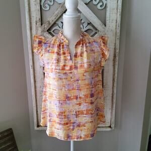 Orange watercolor flutter cap sleeve, ruffle v-neck top by Nanette Lepore.